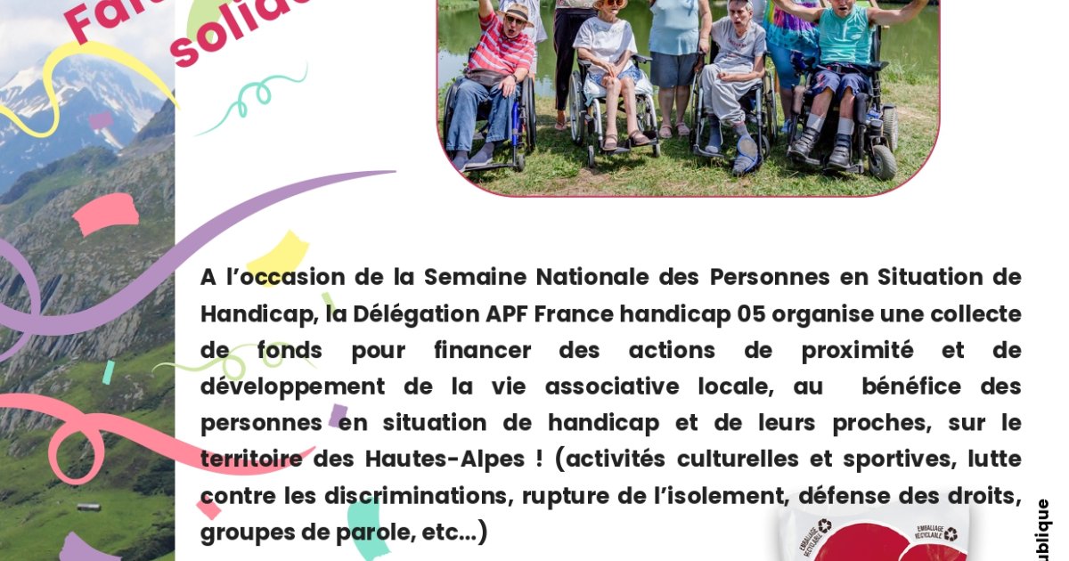 A l'occasion de la Semaine Nationale des Personnes en Situation de Handicap, la Délégation APF France handicap 05 organise une collecte de fonds pour financer des actions de proximité et de développement de la vie associative locale, au bénéfice des personnes en situation de handicap et de leurs proches, sur le territoire des Hautes-Alpes.