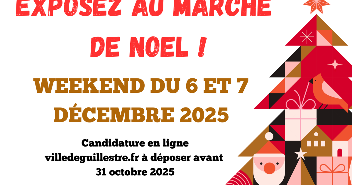 Si vous souhaitez candidater pour exposer dans une des tentes du marché de Noel, place Albert, vous pouvez télécharger le dossier de candidature ICI, à retourner avant le 31 octobre 2025 en mairie ou animation@villedeguillestre.fr.